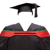 ![]() MTech (LAW) Black, edged with 2 x 20mm Union Jack (red) ribbons lined with college colour satin bordered with a green cord |
